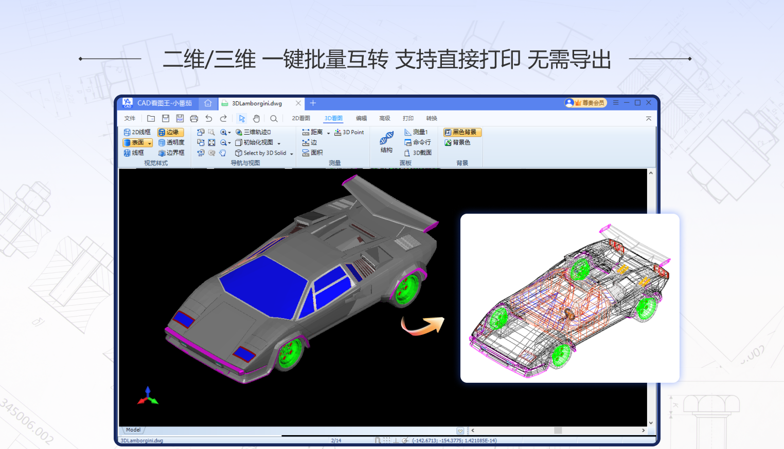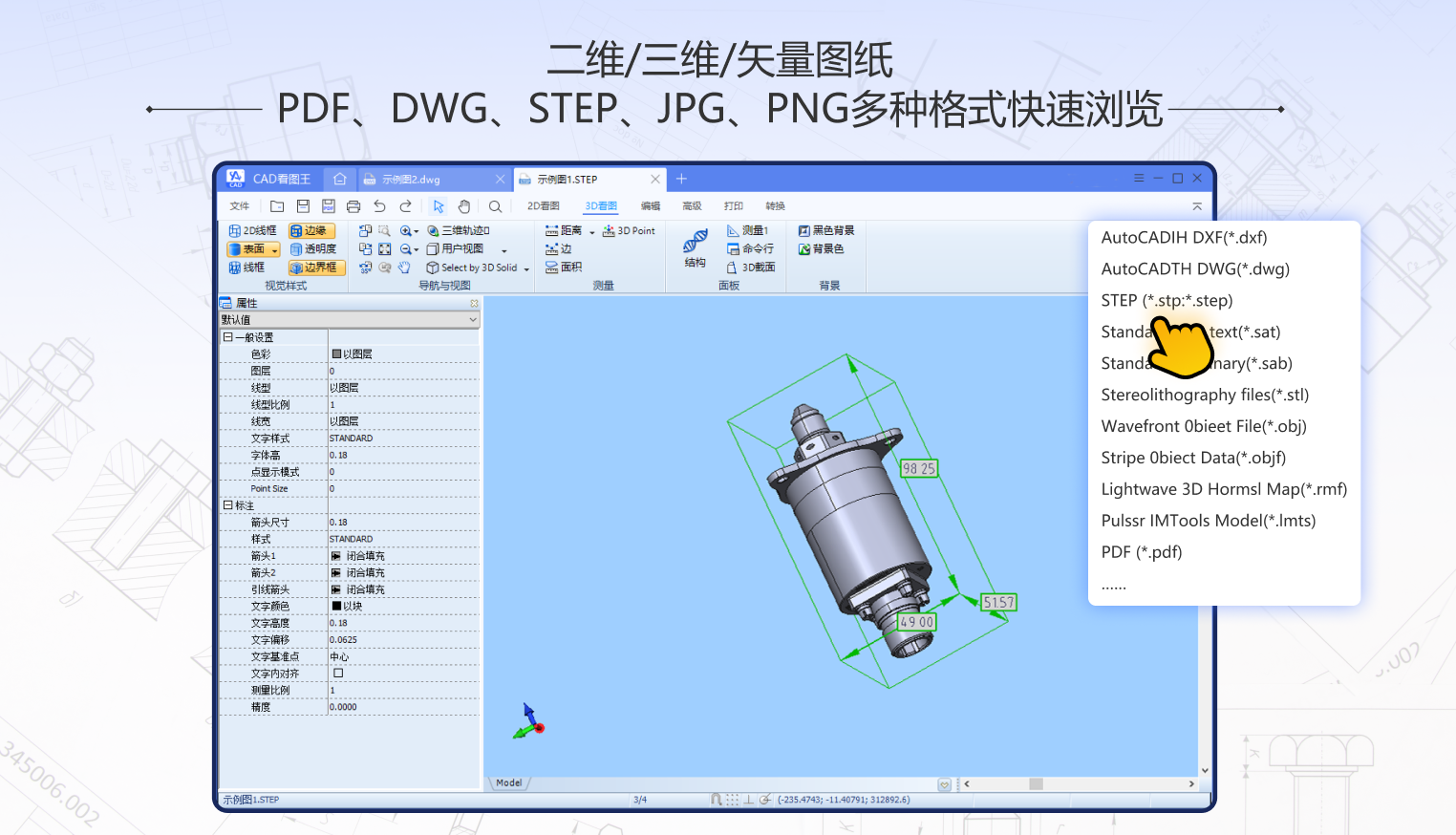 支持浏览DWG、DXF、DWF、DWS、DWT等CAD设计格式图纸;以及STP/STEP、IGS/IGES、STL、CGM、PLT等多种三维/矢量格式图纸