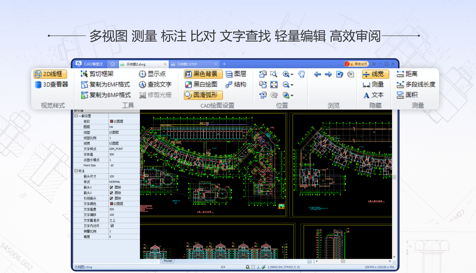 支持图纸绘制、图纸对比、多视图切换、文字查找、批注编辑、距离面积的标注测量 等多种实用功能。